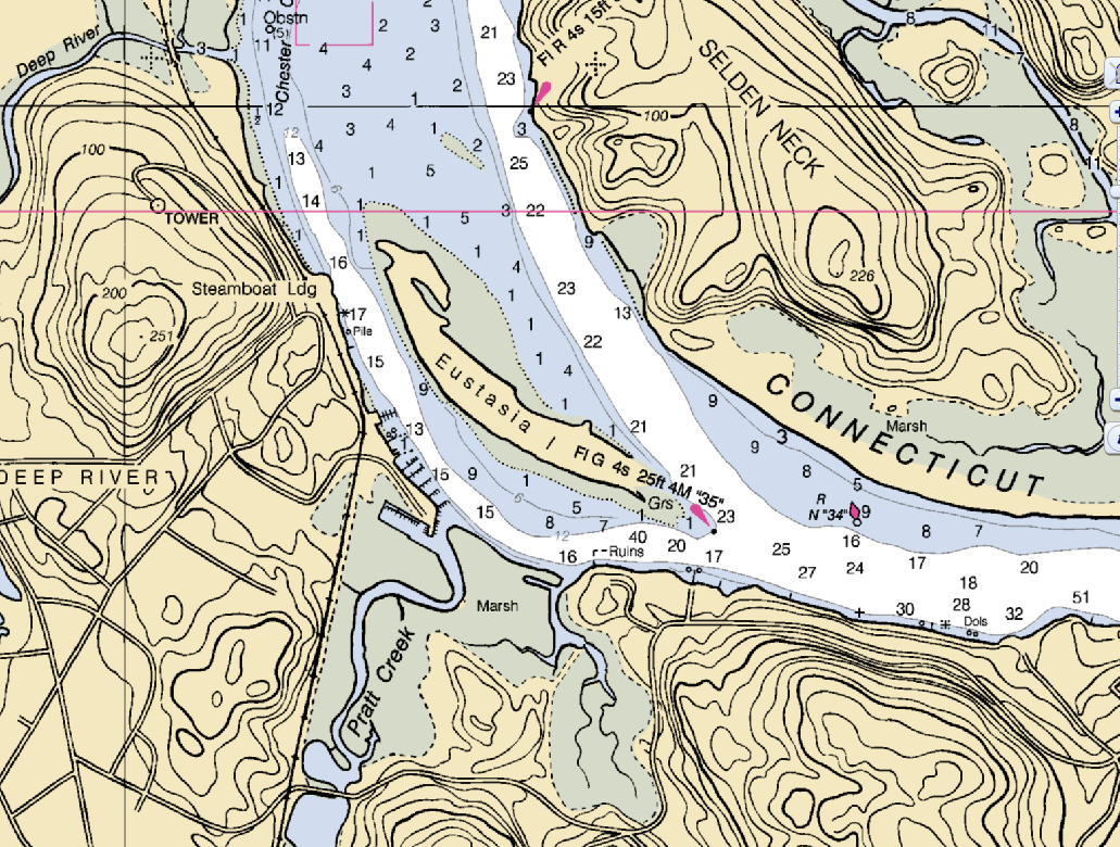 | Travelling up the Connecticut River, as you near N"34", bear to the left and pass with the daymark on the south end of Eustasia Island on your starboard side. Enter the channel west of Eustasia Island and proceed slowly to Deep River marina on your port side. |